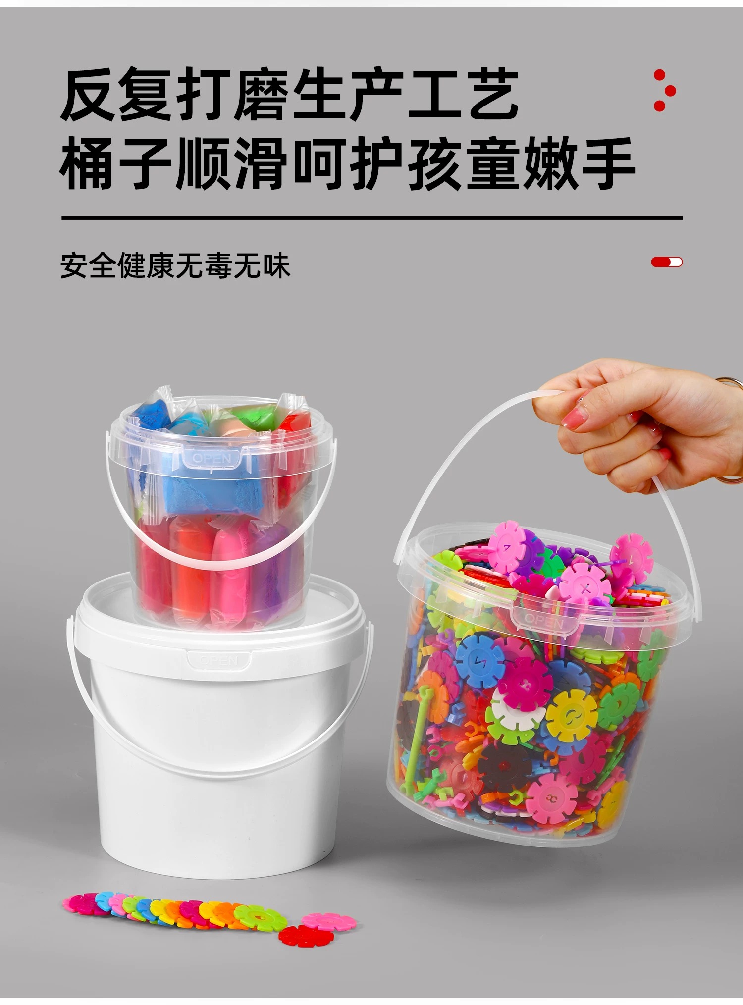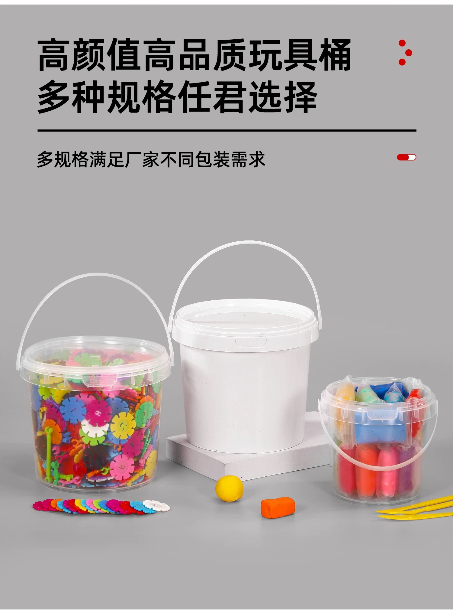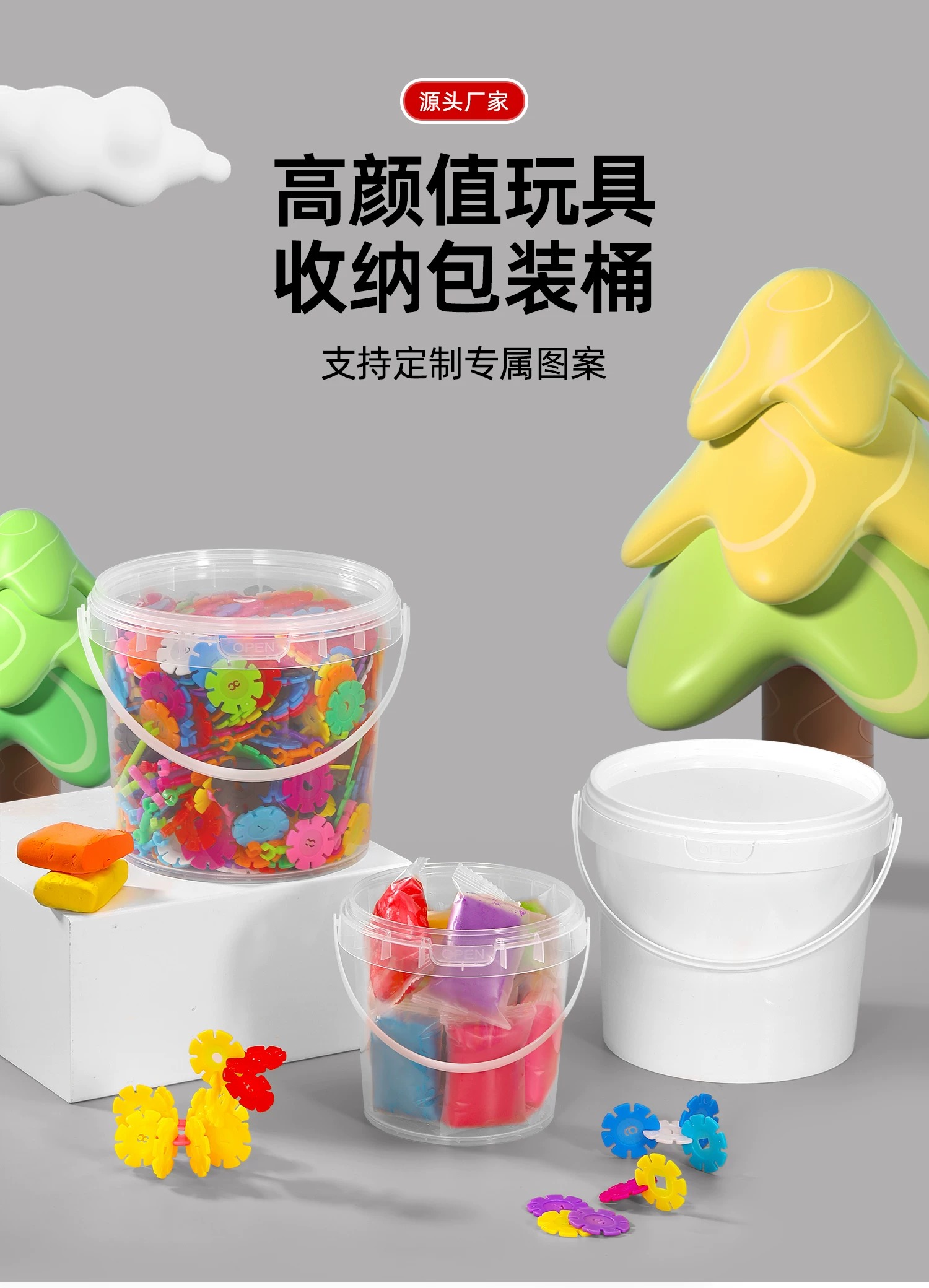 塑料儿童玩具桶在玩具行业中主要用于小型积木、橡皮泥等玩具的出厂封装与运输防护,兼具品牌展示、安全合规提示功能,部分带益智设计(如拼图桶盖)的款式还能延伸作为玩具组件,且用完后可转为家庭玩具收纳容器。