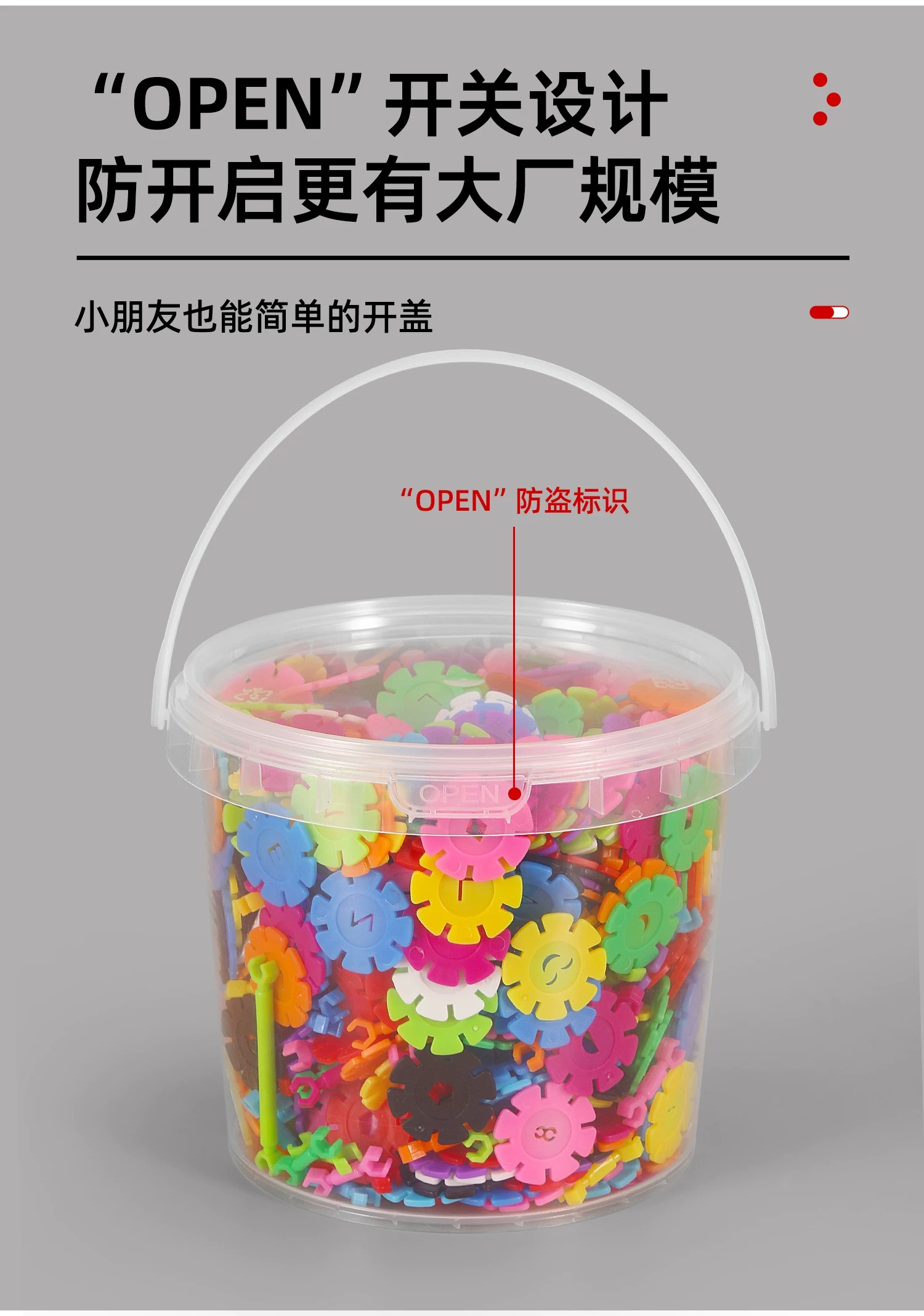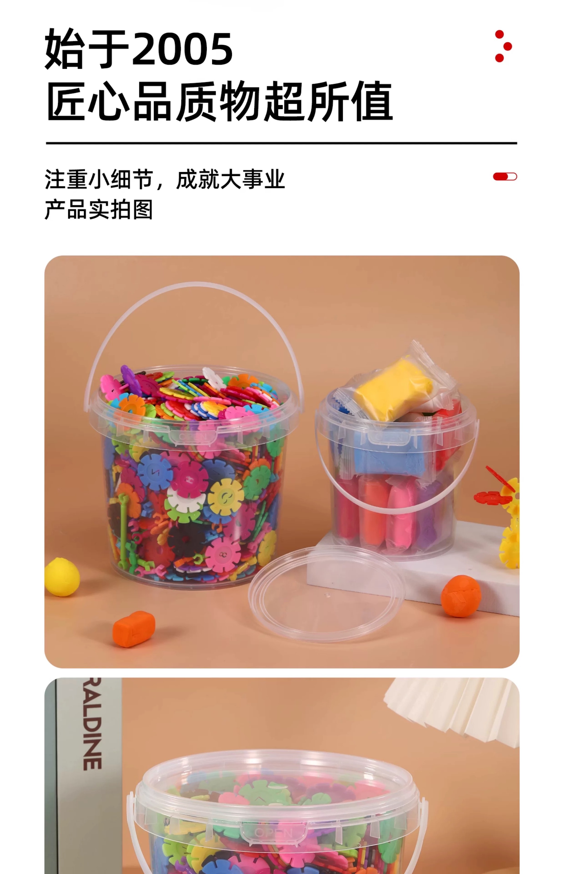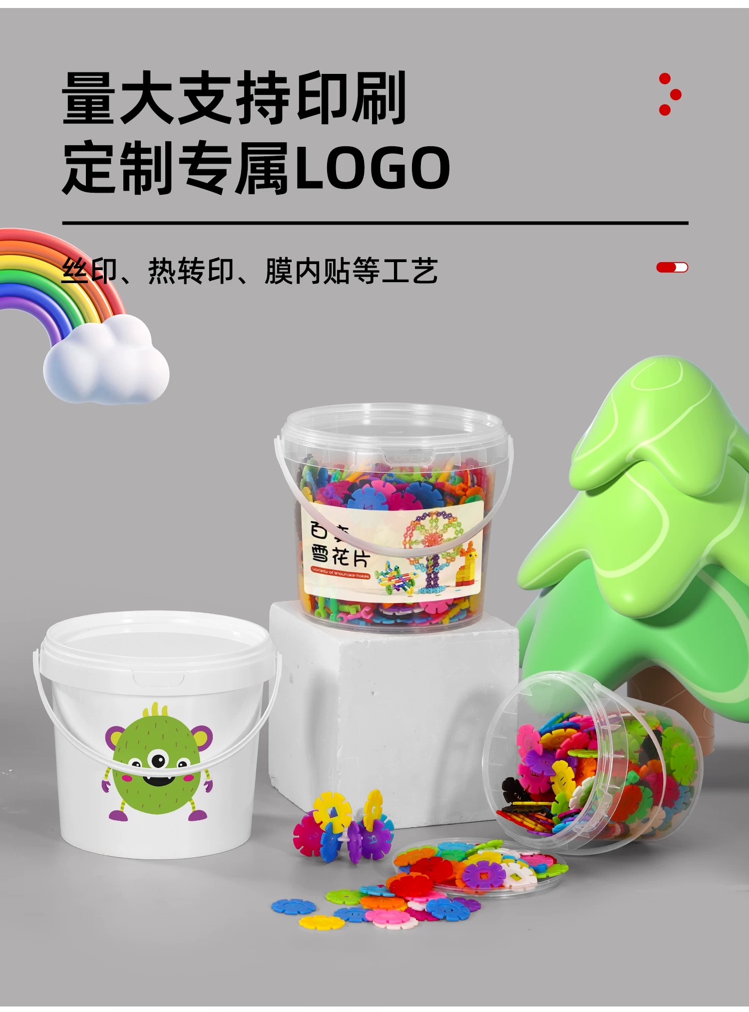 塑料儿童玩具桶在玩具行业中主要用于小型积木、橡皮泥等玩具的出厂封装与运输防护,兼具品牌展示、安全合规提示功能,部分带益智设计(如拼图桶盖)的款式还能延伸作为玩具组件,且用完后可转为家庭玩具收纳容器。